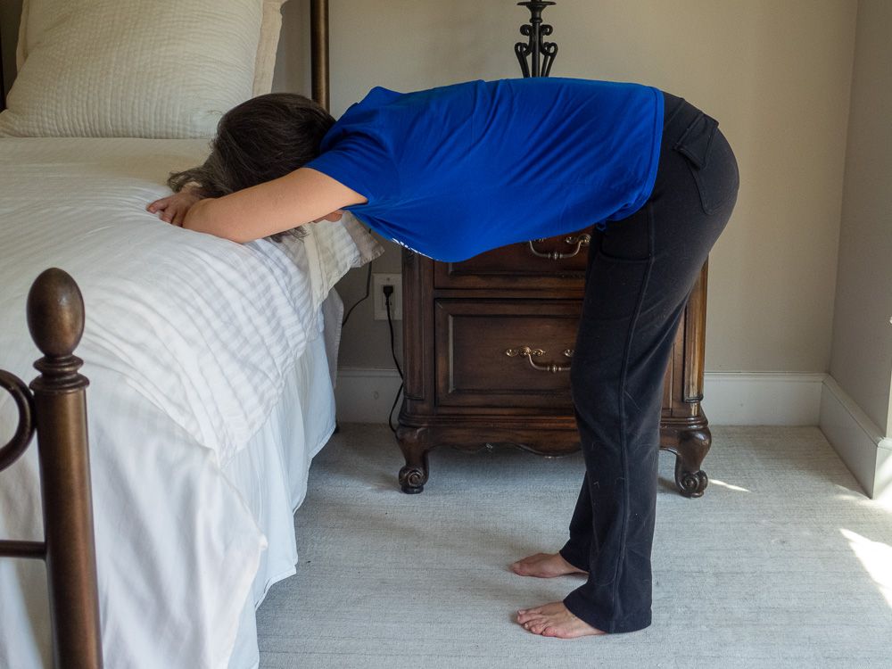 1) Standing facing the side of the bed. Rest your hands on the bed and slowly walk your feet away until your torso is parallel to the floor.