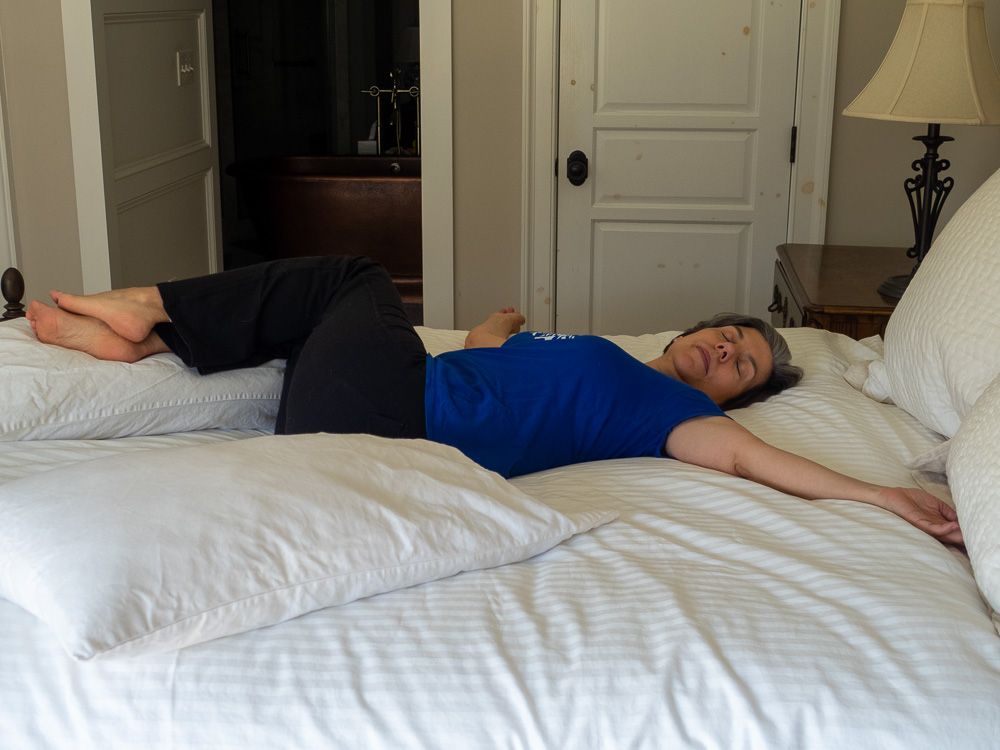 1) Lie flat on your back in the center of your bed with your knees bent and feet flat. Position a bed pillow on either side of your legs. Bring the soles of the feet together, allowing your knees open wide. Adjust the pillows to support your knees so you can relax the inner thighs.