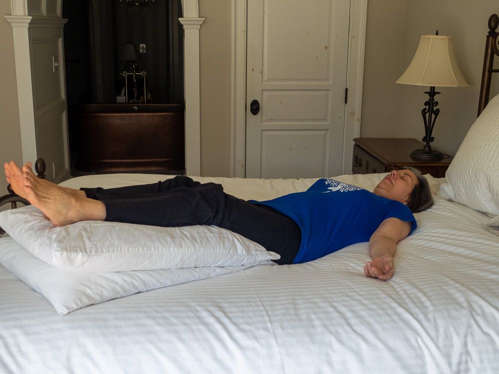 1) Still lying on the bed, position two pillows lengthwise under knees and shins. Your legs should be slightly higher than your torso. Keep your feet relaxed and your arms comfortably resting at your sides, palms up. You may want to cover yourself with a blanket or place a small cloth over your eyes.