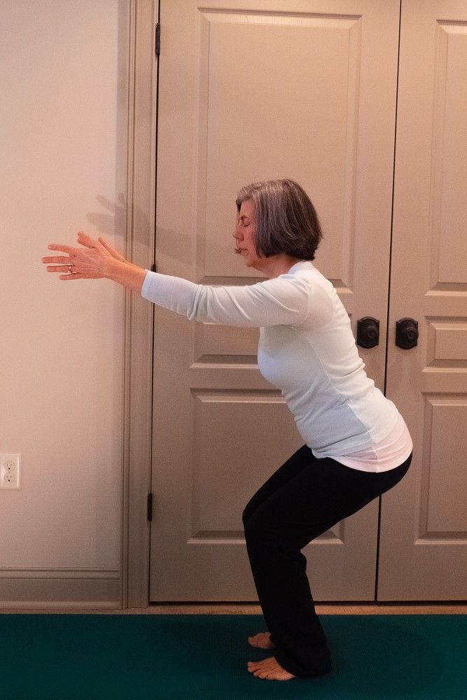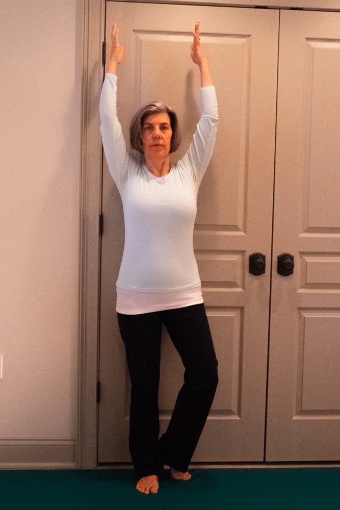 1. Beginning in Mountain pose again, press your back into the wall as you lengthen through the crown of your head.