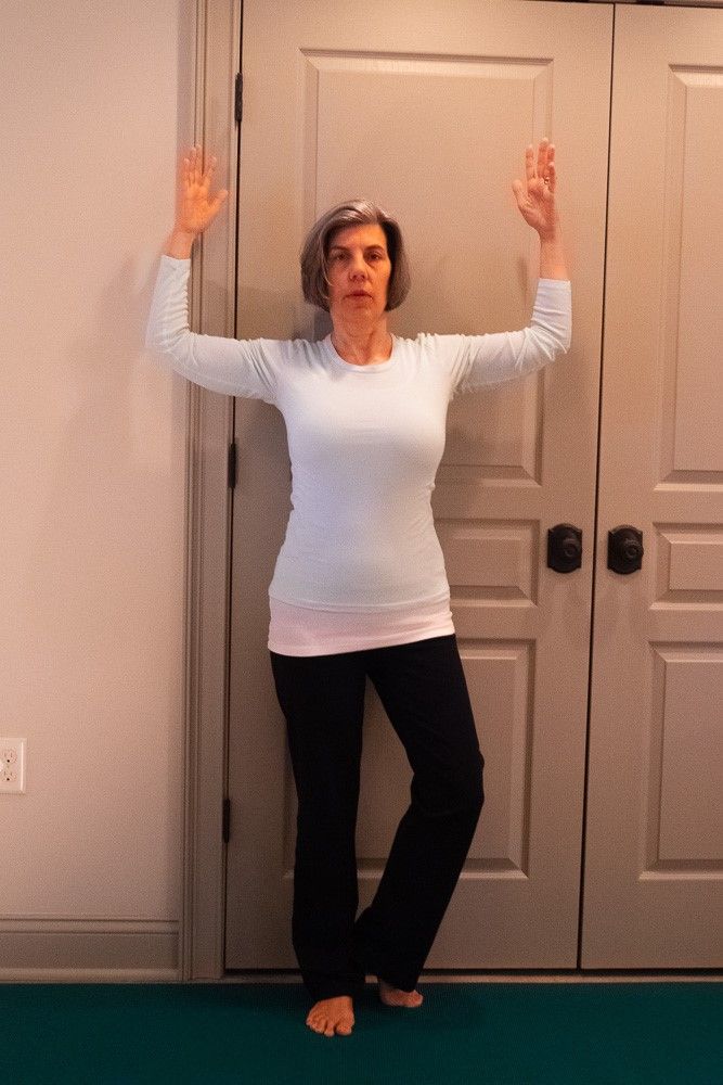 4. Reach both arms up to the ceiling. If your shoulders are tight or you have limited shoulder movement, try bending your elbows into goalpost arms.