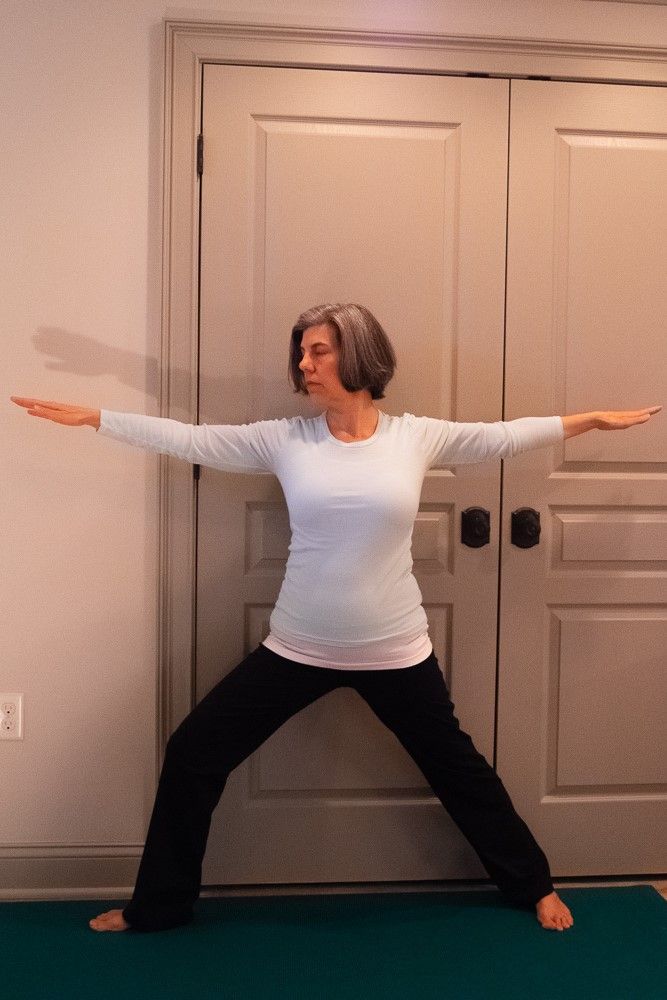 3. Inhale your arms out to the sides, level with your shoulders. Your palms will face down. Pause and hold this position for one breath. Then, on an exhale, lower your arms and straighten your right knee.