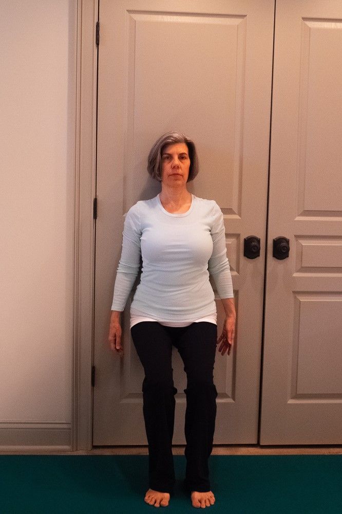 1. Begin in Mountain Pose with your back to a door or wall. Your heels should be approximately one to two inches from the wall.