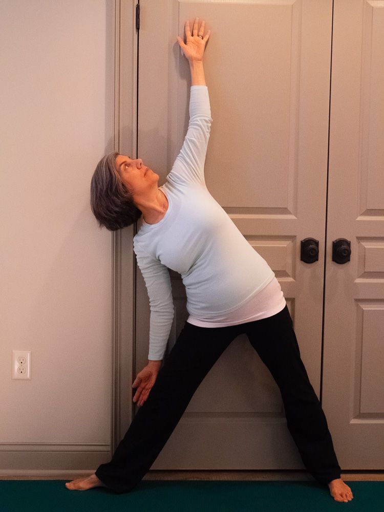 3. Lower the right hand to your thigh (or calf) and reach the left arm towards the ceiling. The back of your left hand may come to the wall but don’t try to force it.