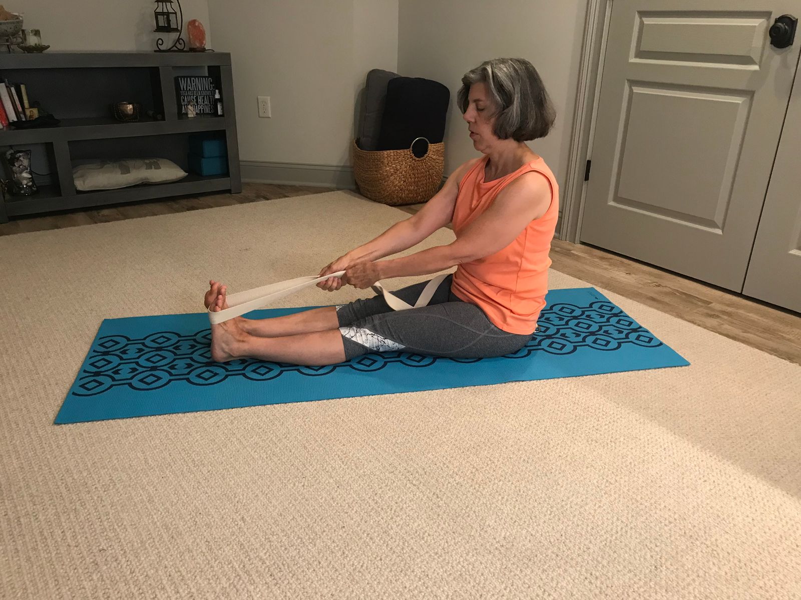 This stretch helps to release tension in the calf and Achilles tendon which often accompany plantar fasciitis. You’ll need a yoga strap, towel or a bathrobe tie for this exercise.