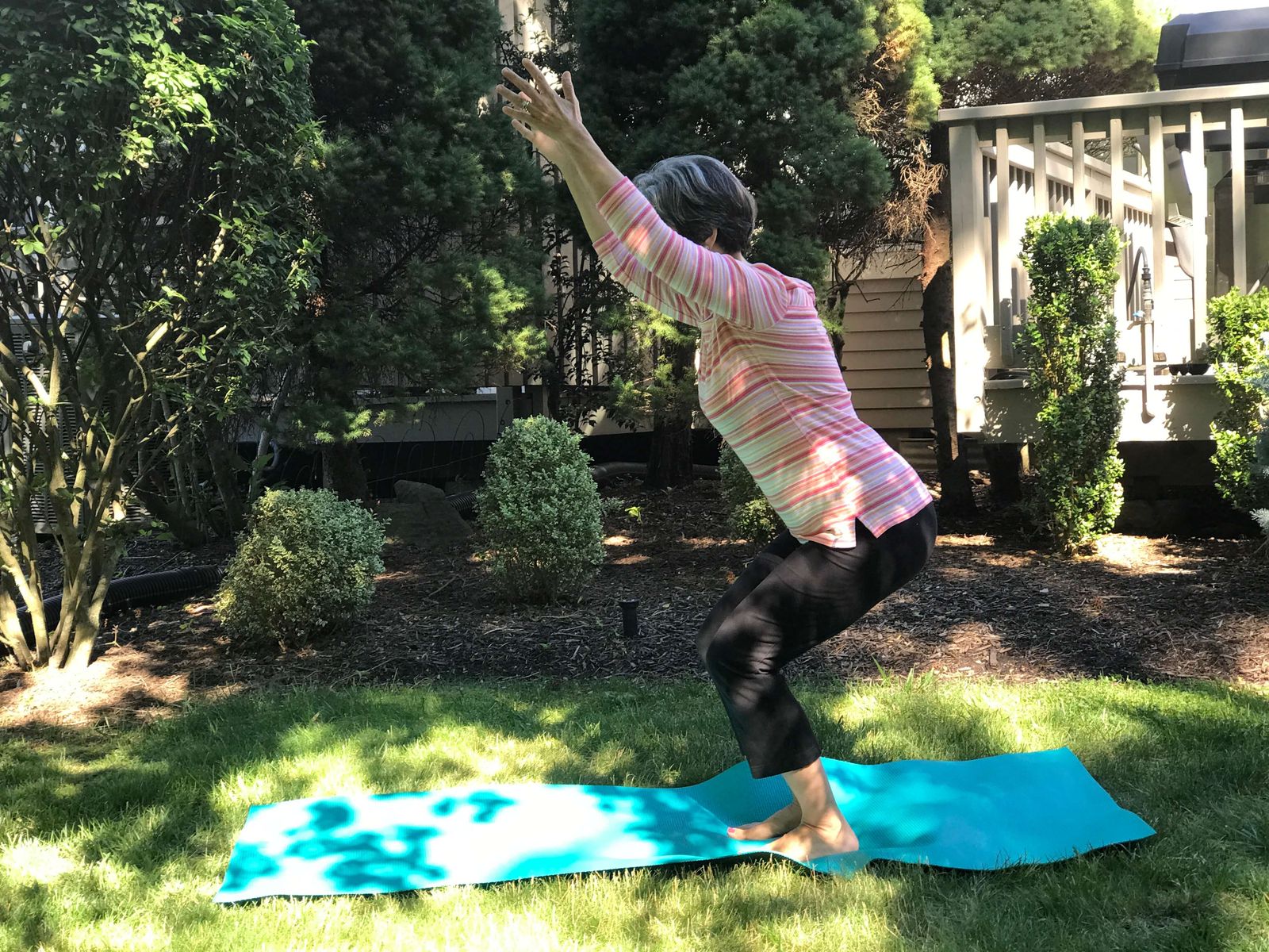 Begin in Mountain Pose (Tadasana) with your feet about hip distance and arms by your sides. Bend both knees, focusing on moving your hips, thighs, and buttocks back to “sit” as you keep your toes pointed straight ahead. Engage your low belly muscles as you raise your arms to shoulder level. Move in and out of Utkatasana 3-4 times with your breath before staying in the pose for two to four breaths.