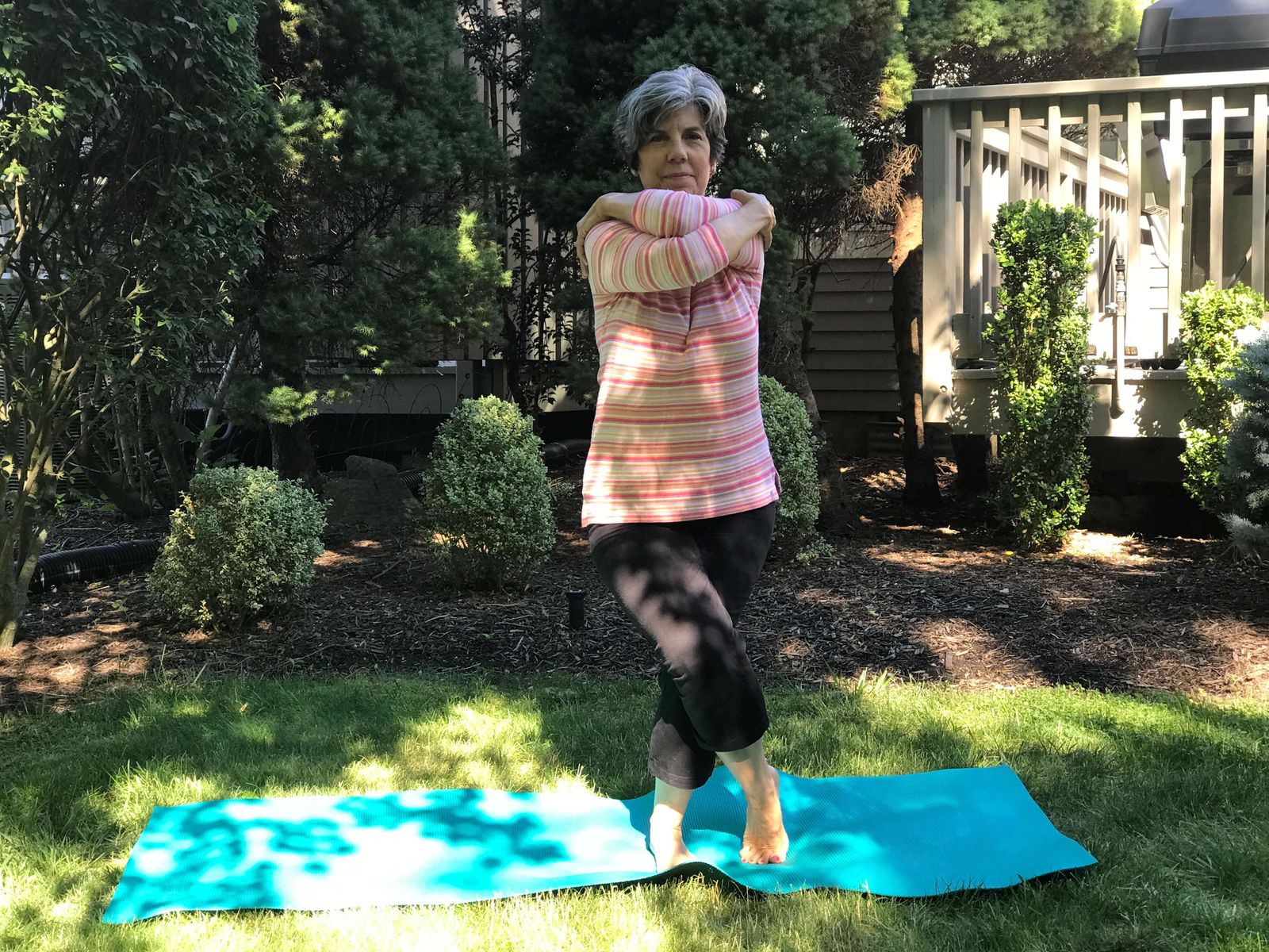 Need more support? Try Garudasana seated in a chair with your left knee crossed over your right. Hug your shoulders as above. Then on an exhale, bring your elbows towards your knees. Be sure to engage your abdominals and maintain a long spine.