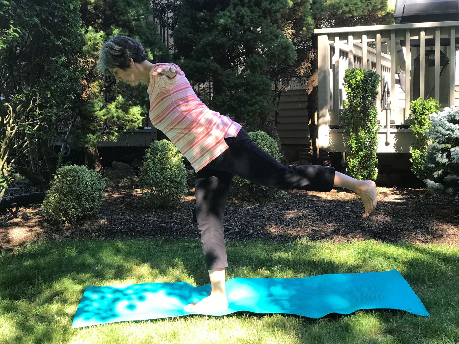 Need more support? Hold the back of a chair instead of lifting the arm. If reaching your foot is difficult, bend the back knee as much as you are able and focus on balancing on the standing leg.