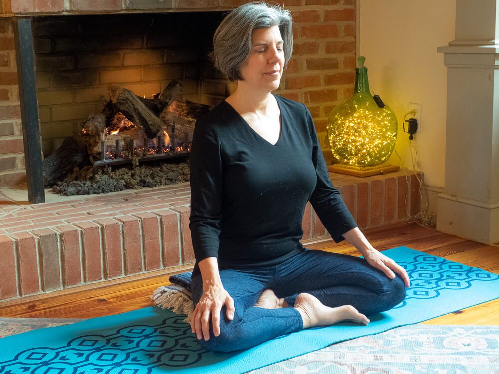 Begin by sitting cross-legged on a cushion or blanket with your spine long and sitz bones connected to the earth. Rest palms facedown on your knees or thighs. Notice the unhurried rhythm of your breath. After a few breaths, begin to lengthen your inhales and exhales, striving for a ratio of three to four count inhale and four to five count exhale for several breaths. Imagine your spine lengthening with each inhale and your sitz bones grounding as you exhale. Set an intention for your practice.