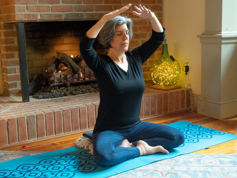Allow your hands to relax at your sides, fingertips to touching the ground. On an inhale, lift both arms overhead, gazing upward. Turn your palms towards the floor, exhaling as you lower your hands in front of your torso. Imagine sending your energy into the earth, bringing steadiness to mind and body. Repeat three times.