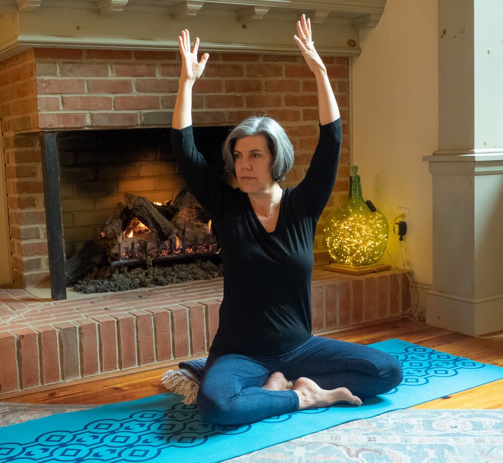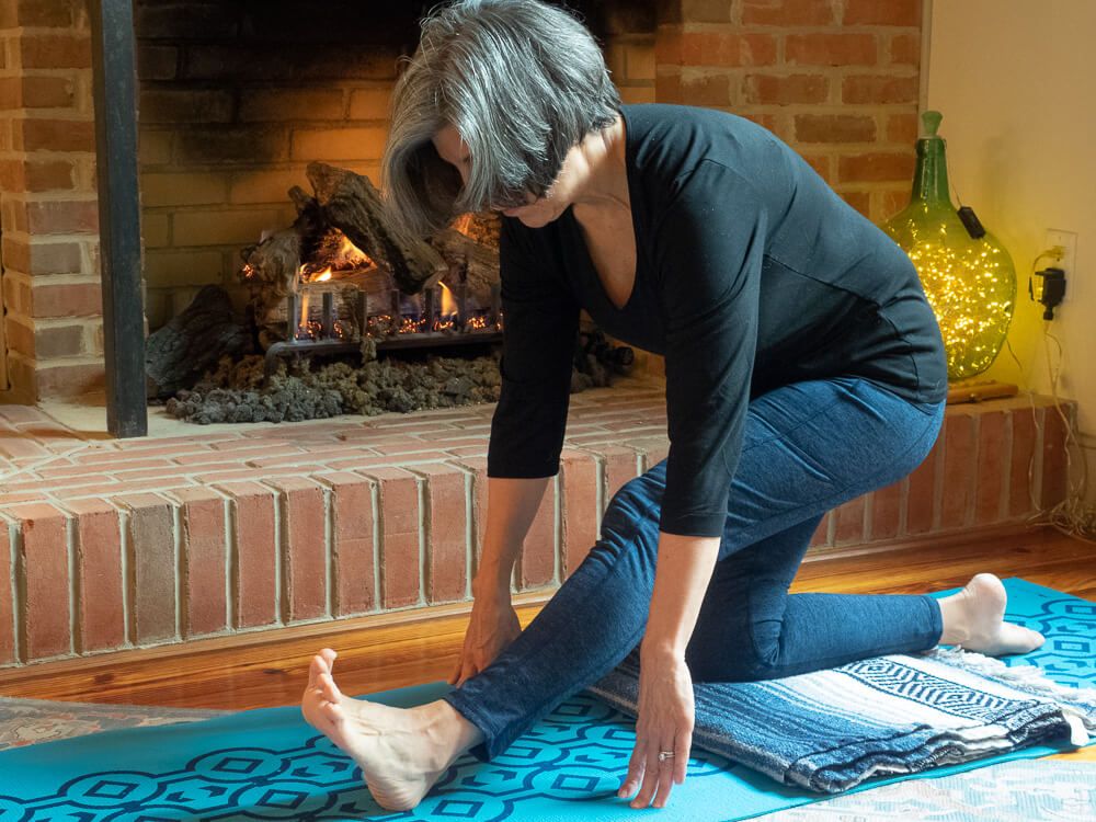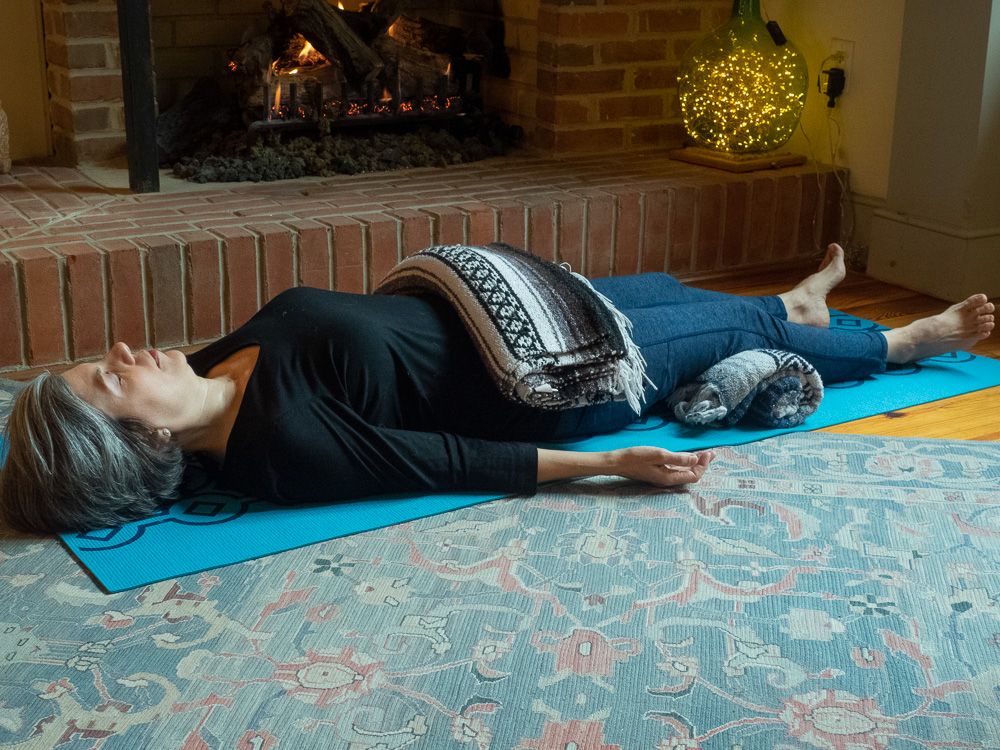 So tempting to skip this part, but don’t. Savasana, the ultimate resting pose, should be warm and cozy. Wrap yourself up in a soft, heavy blanket and put on warm socks and cover your eyes with an eye pillow or a scarf. Place a cushion or folded blanket under your knees and head as well as over your lower abdomen for additional grounding. Rest the palms down on the earth or place one hand on your heart and one hand on your belly. Remain here for 10 or more minutes, savoring the soothing warmth generated from this practice.