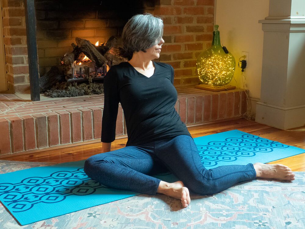 Use your breath to facilitate the movement of the arms in the next two poses. Twists help with digestion which can become a bit sluggish this time of year.