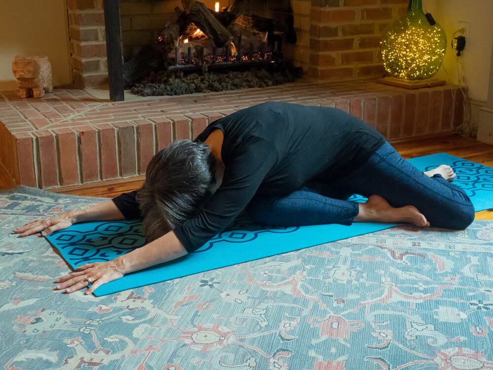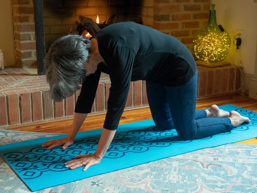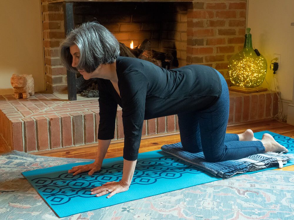 Transition onto your hands and knees into tabletop pose, connecting your palms firmly to the earth. If your knees are sensitive, place a folded blanket under them. Begin by gently arching the spine and lifting your gaze as you inhale into cow pose. As you exhale, round the back and drop the chin towards the chest into cat pose. Repeat three to five times. Then bend your elbows, resting your forearms on the floor and bringing your hips toward your heels into child’s pose.