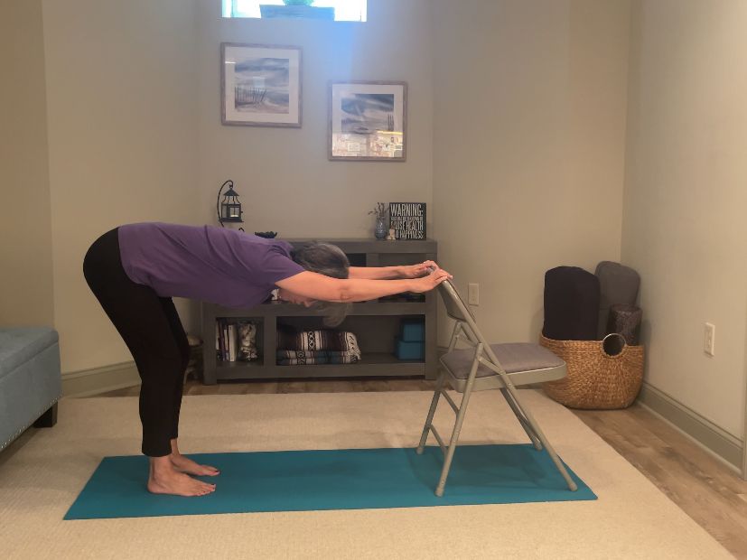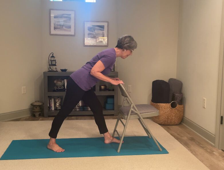 Holding the back of the chair, walk both feet back three to four feet to create an inverted L-shape with your body.